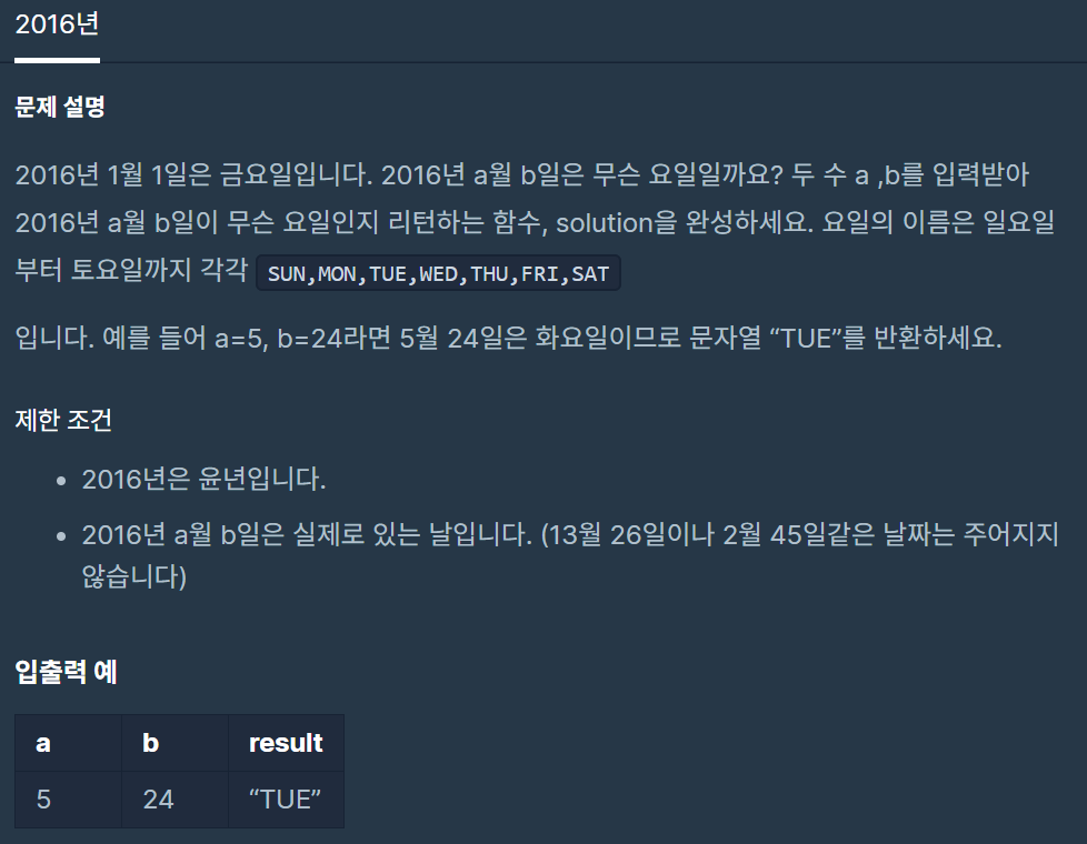 2016년 1월 1일은 금요일입니다. 2016년 a월 b일은 무슨 요일일까요? 두 수 a ,b를 입력받아 2016년 a월 b일이 무슨 요일인지 리턴하는 함수, solution을 완성하세요. 요일의 이름은 일요일부터 토요일까지 각각 SUN,MON,TUE,WED,THU,FRI,SAT 입니다. 예를 들어 a=5, b=24라면 5월 24일은 화요일이므로 문자열 TUE를 반환하세요. 제한 조건 2016년은 윤년입니다. 2016년 a월 b일은 실제로 있는 날입니다.