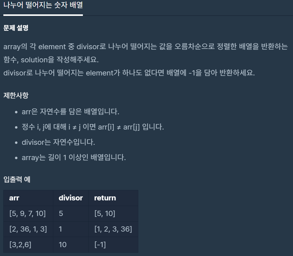array의 각 element 중 divisor로 나누어 떨어지는 값을 오름차순으로 정렬한 배열을 반환하는 함수, solution을 작성해주세요. divisor로 나누어 떨어지는 element가 하나도 없다면 배열에 -1을 담아 반환하세요. 제한사항 arr은 자연수를 담은 배열입니다. 정수 i, j에 대해 i ≠ j 이면 arr[i] ≠ arr[j] 입니다. divisor는 자연수입니다. array는 길이 1 이상인 배열입니다. 입출력 예 arr divi