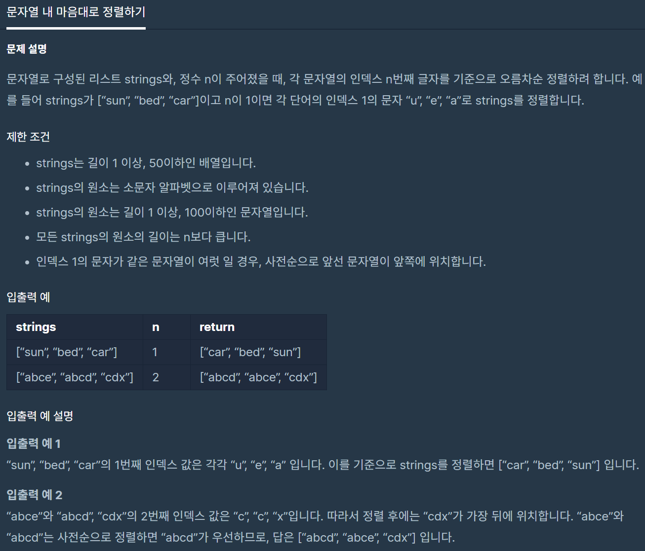 코딩테스트 연습 - 문자열 내 마음대로 정렬하기 | 프로그래머스