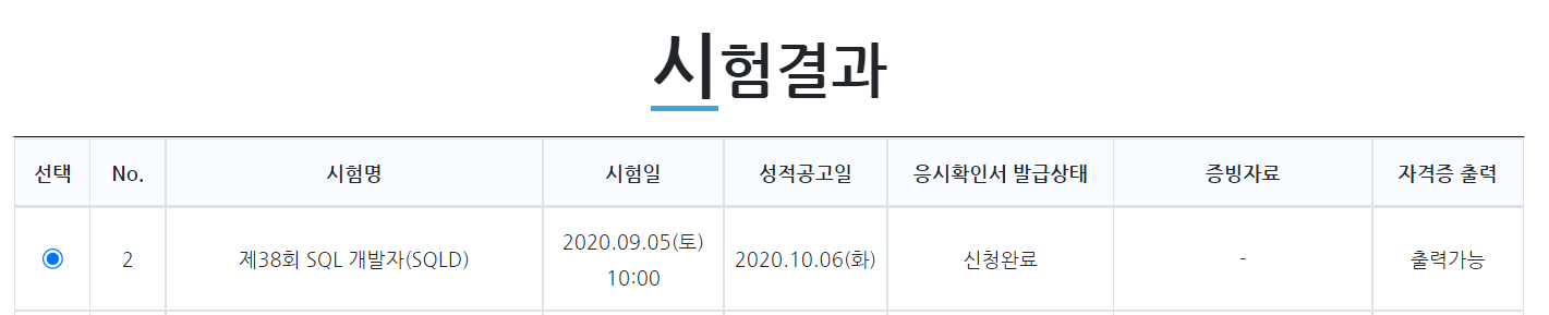 2020년 9월 5일에 시행된 제 38회 SQLD 시험에 응시하고 합격했다.