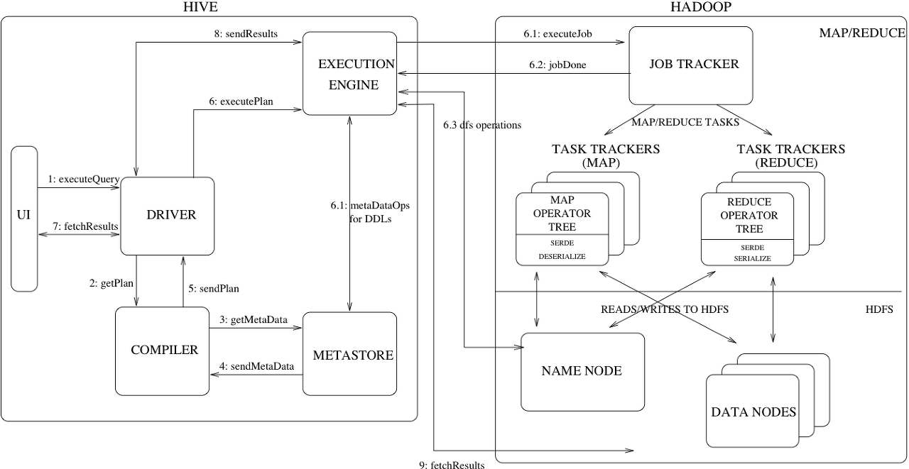 - Metastore - 다양한 테이블의 모든 구조 정보와 칼럼과 칼럼 타입 정보를 포함한 웨어하우스내 파티션을 저장하는 컴포넌트로, serializers 와 deserializers 는 데이터를 읽고 쓰거나 데이터가 저장되는 HDFS 파일이 필요하다.